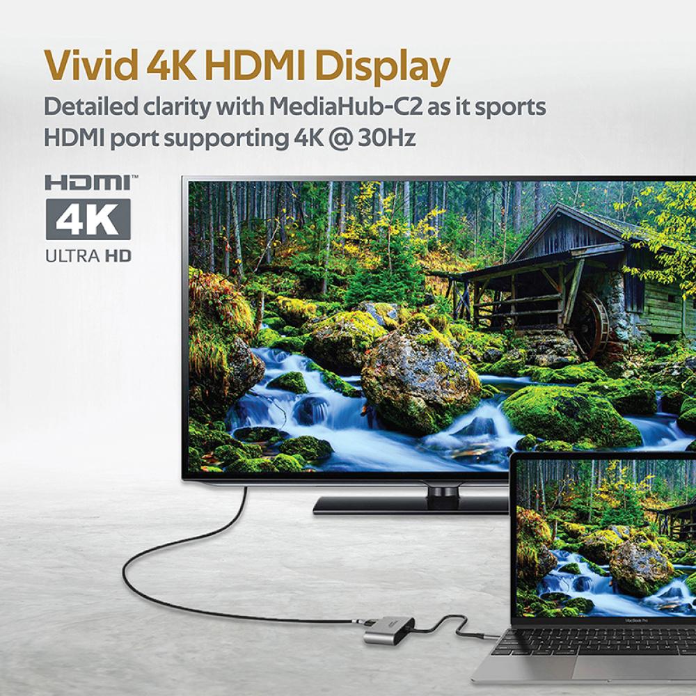 تم تصميم MediaHub-C2 للحصول على أفضل تجربة مشاهدة، وهو عبارة عن محول USB-C™ إلى HDMI وVGA. يتيح لك المحول توصيل أجهزة USB-C™‎ بشاشات عرض أخرى متوافقة مع VGA وHDMI. يوفر منفذ HDMI صورة واضحة ومفصلة وصوت مثالي لمشاهدة مقاطع الفيديو بدقة 4K عند 30 هرتز. يتميز MediaHub-C2 بمنفذ VGA حتى تتمكن من الاستمتاع بالوسائط بدقة 1080 بكسل بمعدل تحديث 60 هرتز دون انقطاع. يعد محول USB-C™ ضروري إذا كنت ترغب في الاستمتاع بتجربة مشاهدة متواصلة ومستقرة وعالية الوضوح. يتوافق موزع USB-C™ مع جميع أجهزة الكمبيوتر والهواتف الذكية والأجهزة اللوحية التي تدعم USB-C™.