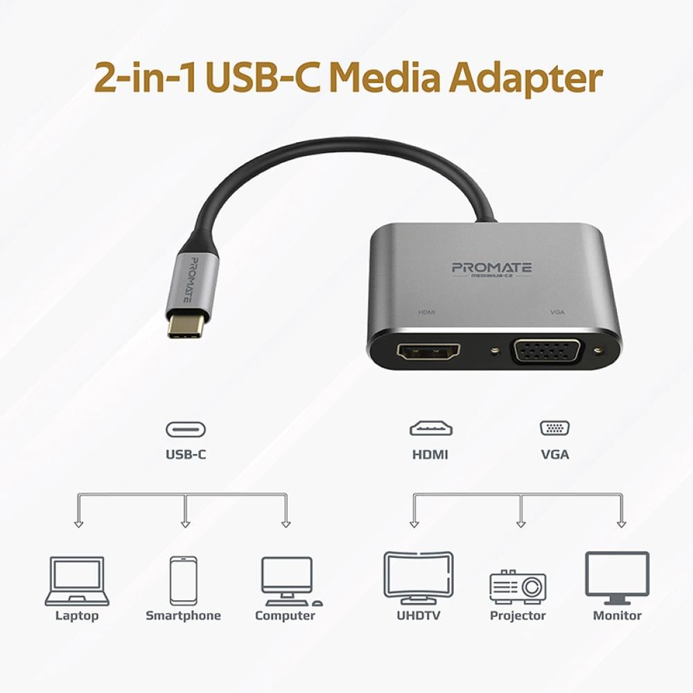 أفضل محول شاشة USB-C عالي الوضوح يدعم الفيديو HDMI بدقة 4K مع دعم VGA بدقة 1080 بكسل وسهولة التوصيل والتشغيل من بروميت - Promate MediaHub-C2