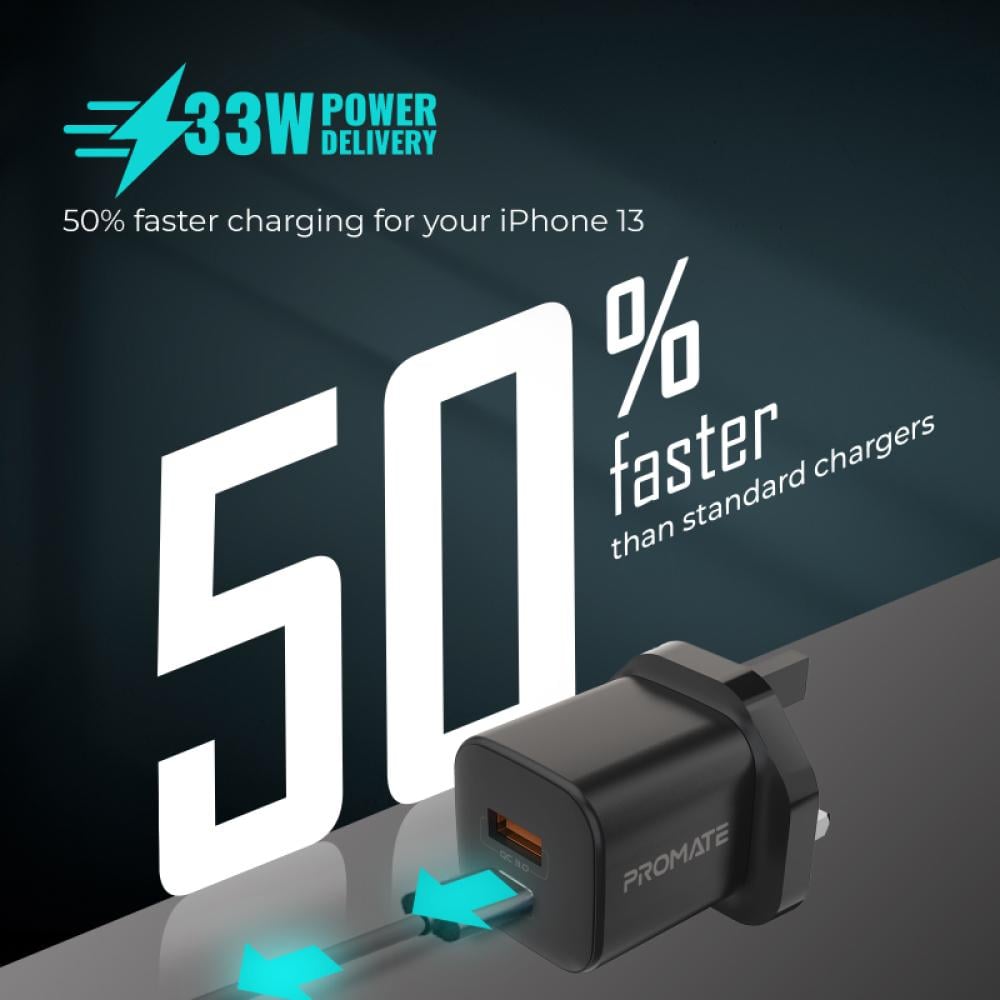 منفذ توصيل الطاقة USB-C™ بقدرة 33 واط للشحن السريع النهائي: يستضيف هذا المحول القوي منفذ توصيل الطاقة USB-C™ الذي يعد مثاليًا لشحن جهازك المتوافق مع USB-C™. مع توصيل طاقة بقوة 33 واط، يمكنك الحصول على سرعة شحن أسرع بنسبة 50% من محول الشحن Promate PowerPort-33 مقارنةً بالشواحن القياسية.