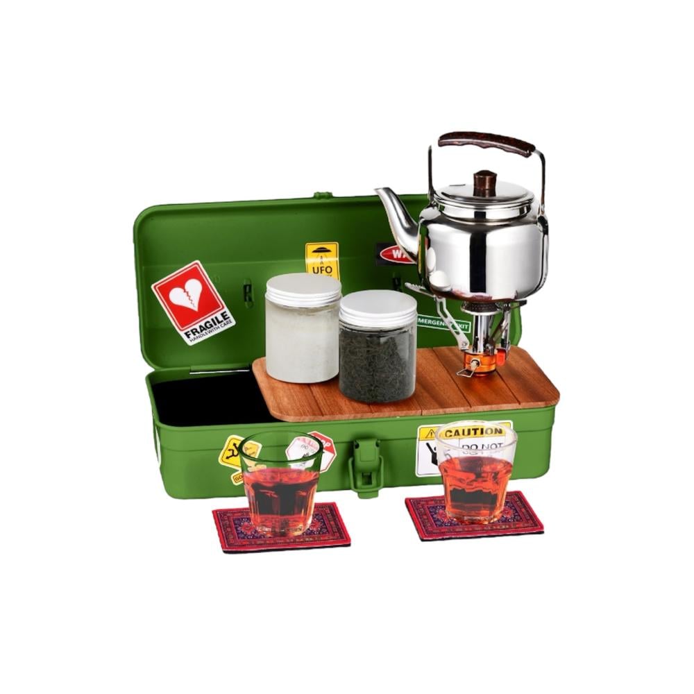 مجموعة متكاملة لتحضير الشاي أثناء التخييم أو الرحلات، تأتي داخل صندوق معدني أخضر أنيق يمكن حمله بسهولة.