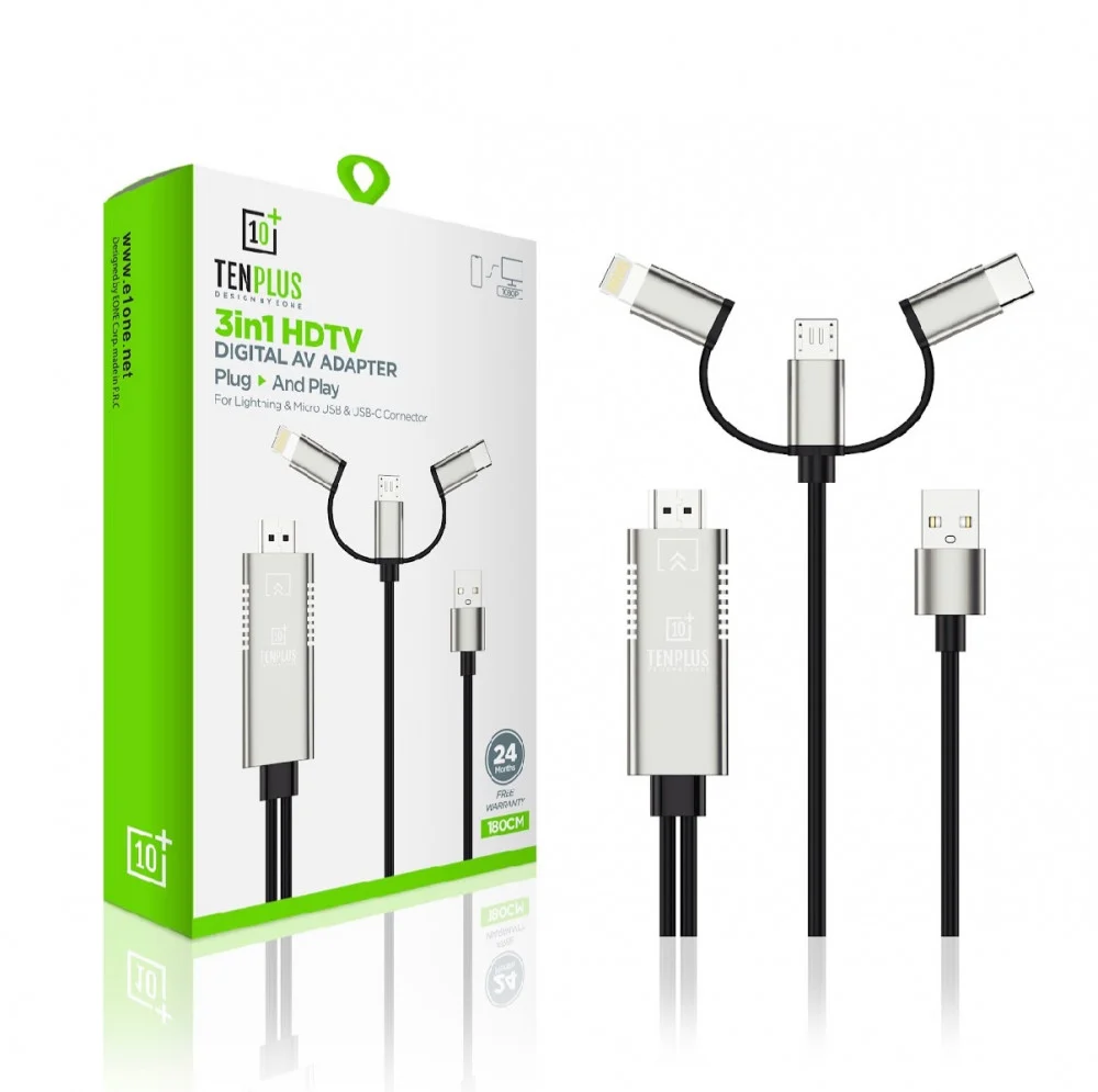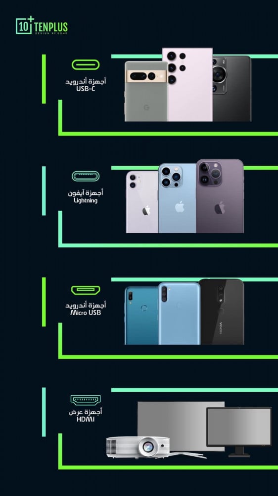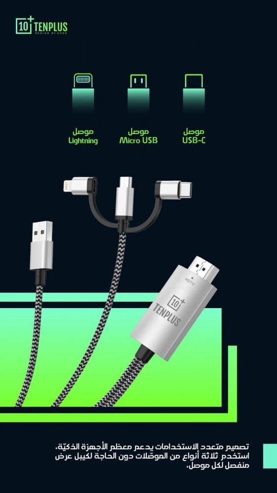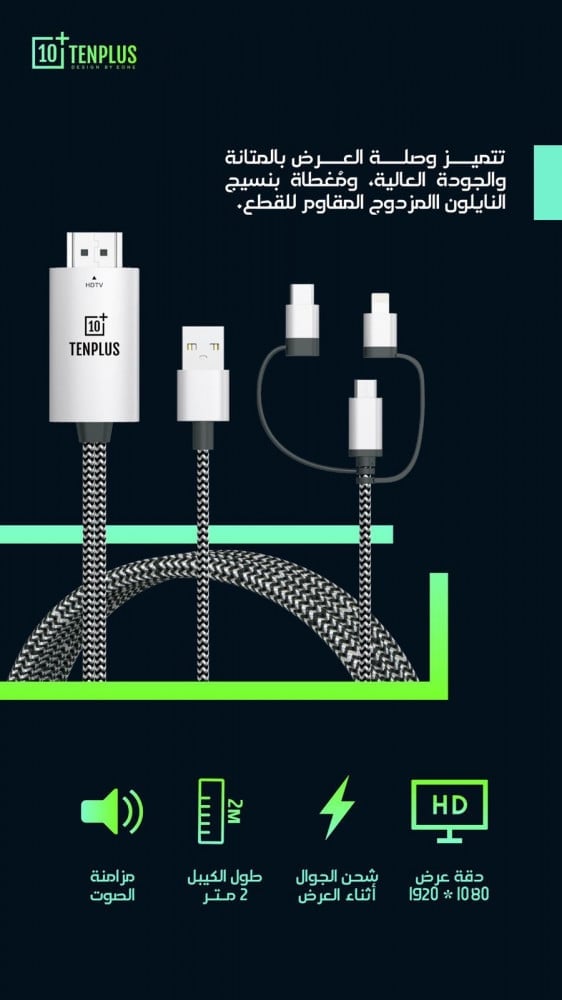 • كابل HDMI إلى جميع الأنظمة يدعم نقل ما يتم عرضه على شاشة جهاز الموبايل على جهاز التلفزيون المزود بمنفذ HDMI أو شاشة مراقبة أو جهاز عرض.