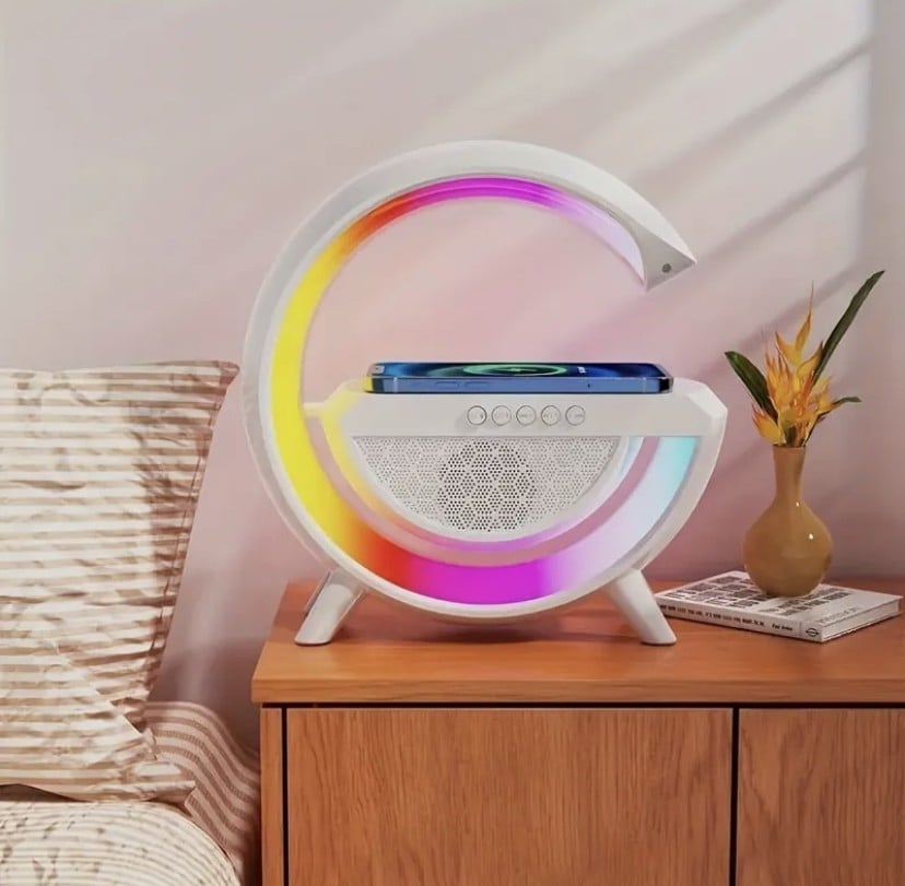 منصة شحن لاسلكي مزودة بسماعة سبيكر وراديو ، تحتوي على إضاءة LED متعددة الألوان