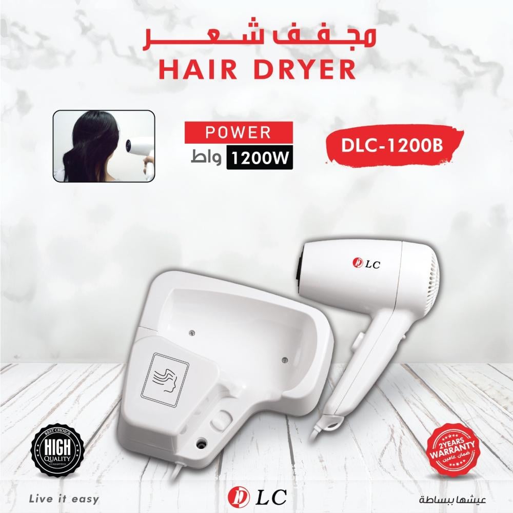 مجفف شعر صغير ومحمول من DLC، يتميز بلونه الأبيض وتصميمه المدمج. يعمل بقوة 1200 واط، مما يجعله مثاليًا للاستخدام اليومي أو للسفر.