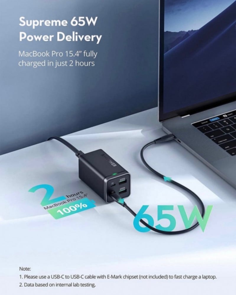 - توصيل الطاقة 65 وات: يضخ شاحن USB 65 واط من الطاقة لنقل جهاز MacBook Pro 15.4 بوصة من 0 إلى 100٪ في ساعتين فقط عند توصيل جهاز واحد فقط بمنفذ USB-C