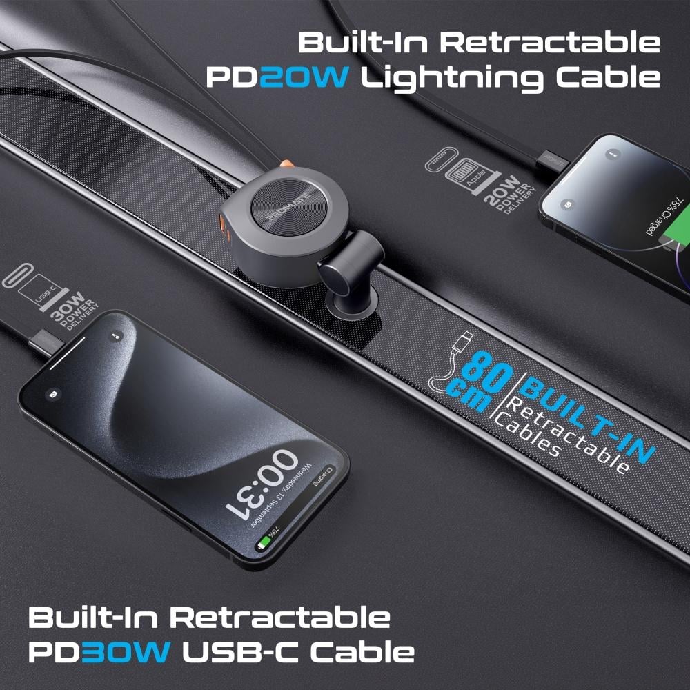 - كيبل USB-C قابل للسحب بقوة PD30W مدمج: الكيبل المدمج من نوع USB-C بقوة PD30W يمكن سحبه للتخزين السهل، مما يوفر تجربة شحن سلسة دون الفوضى.
