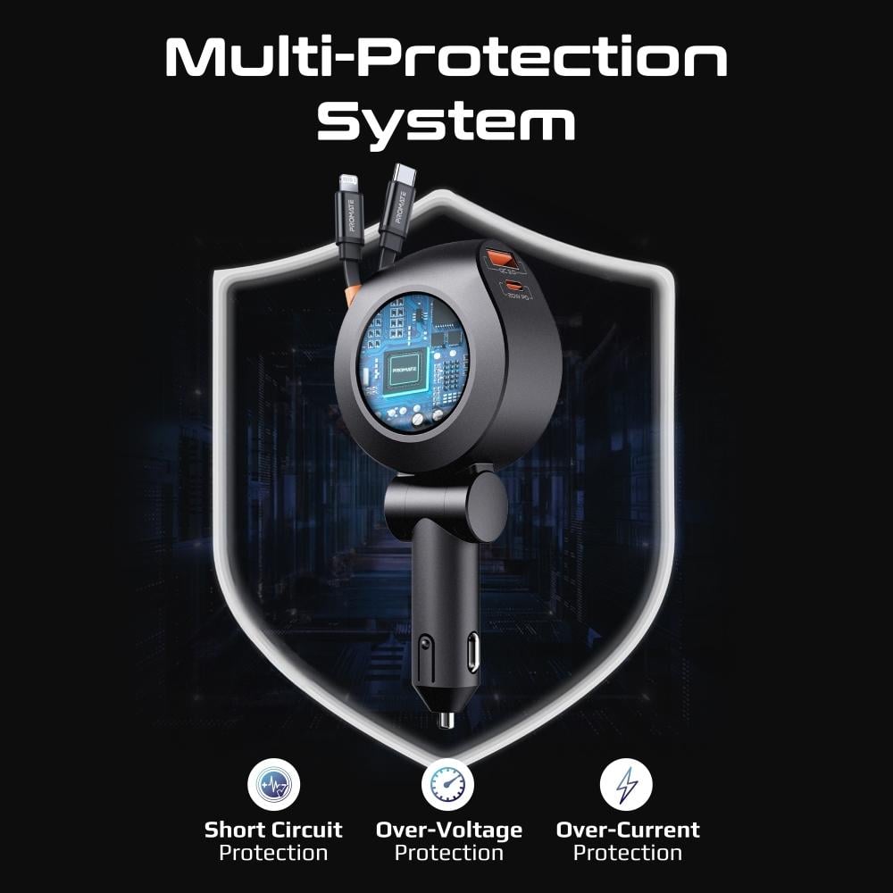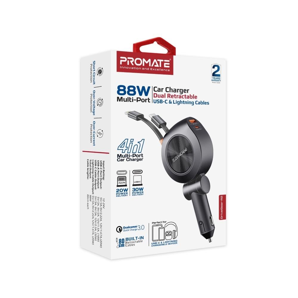 يتميز شاحن السيارة DriveGear-R2 من بروميت بكابليه القابلين للسحب، مما يحول سيارتك إلى محطة شحن متعددة الاستخدامات لأجهزتك الرقمية. قم بشحن ما يصل إلى أربعة أجهزة في آن واحد بفضل تصميمه المبتكر متعدد المنافذ 4 في 1. يوفر هذا الشاحن الأنيق قدرة طاقة تصل إلى 88 واط، ويشمل كابلات USB-C بقوة PD30W و لاياتيتغ بقوة PD20W القابلة للسحب، بالإضافة إلى منافذ USB-C بقوة 20 واط وUSB-A بقوة 18 واط. يتميز بتصميم قابل للدوران بزاوية 180 درجة، مما يوفر مرونة لا مثيل لها، مصمم لضمان الأمان والأداء الأمثل، يحتوي DriveGear-R2 على نظام حماية متعددة مقاومة للحرارة وحماية من الزيادة في الجهد وحماية من الدوائر القصيرة، مما يجعله الرفيق المثالي للشحن السريع والموثوق أثناء التنقل.