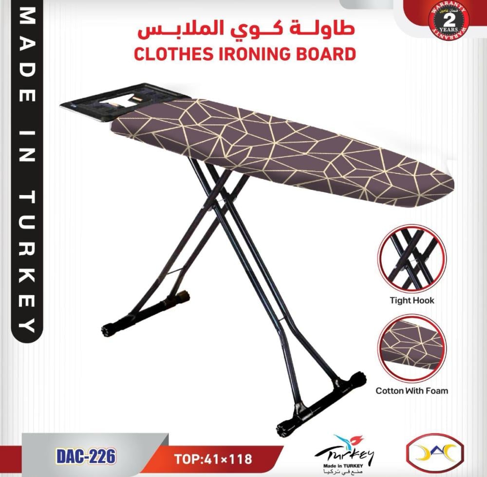 طاولة كي ملابس عملية ومتينة صنع في تركيا تتميز بتصميم قابل للطي وأبعاد واسعة مزودة بمسند للمكواة وغطاء مبطن بـ القطن والرغوة لضمان انزلاق سهل للمكواة ونتائج كي احترافية. تحتوي على خطاف تثبيت محكم لتوفير الثبات والأمان أثناء الاستخدام والتخزين.