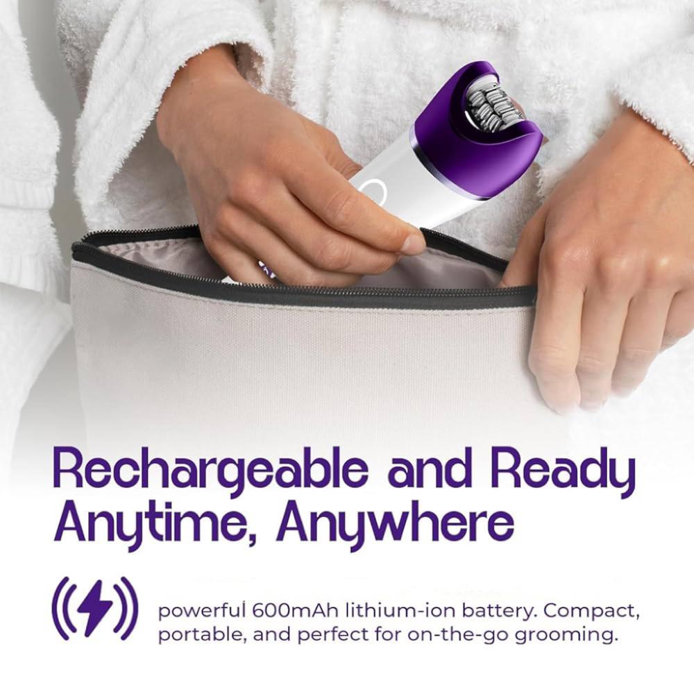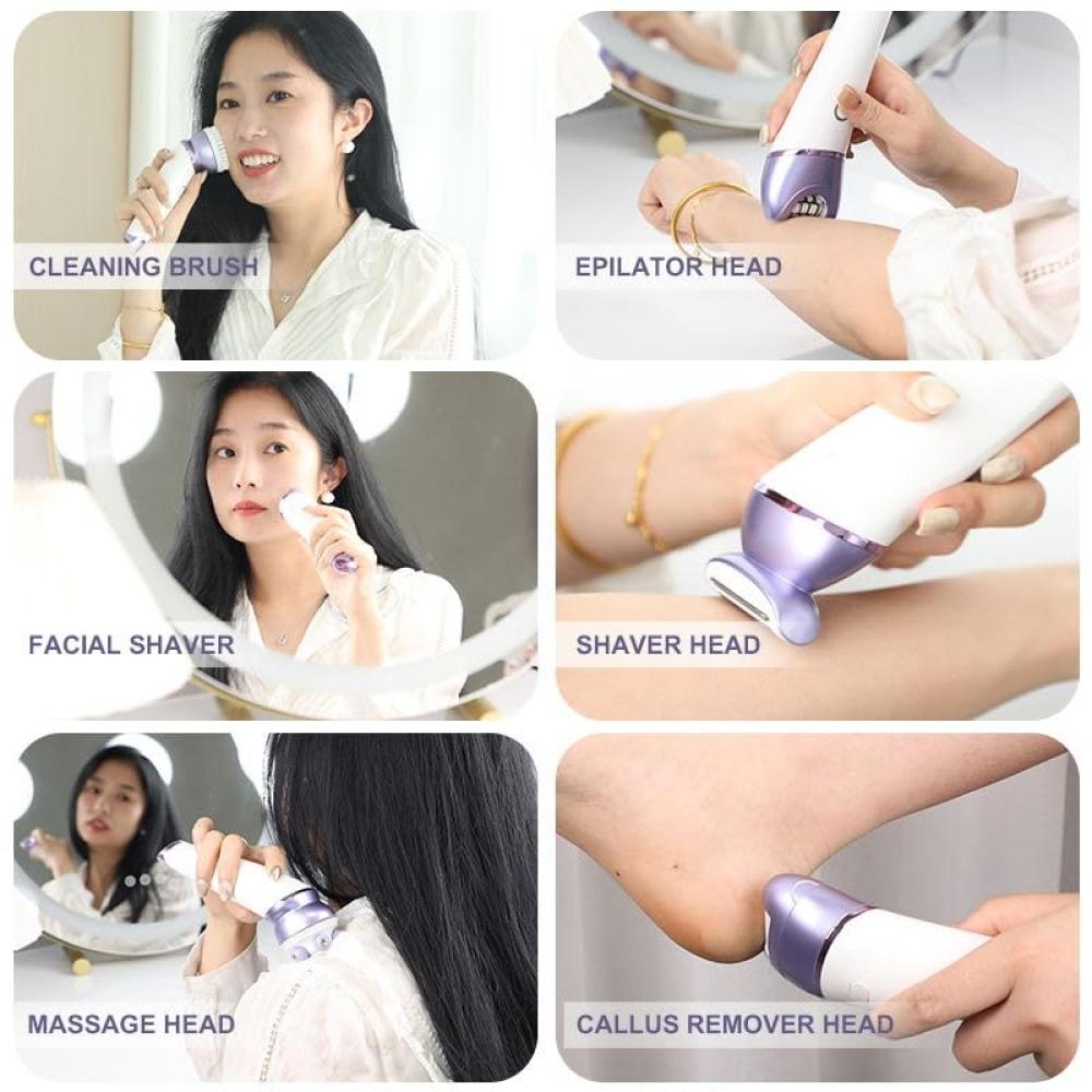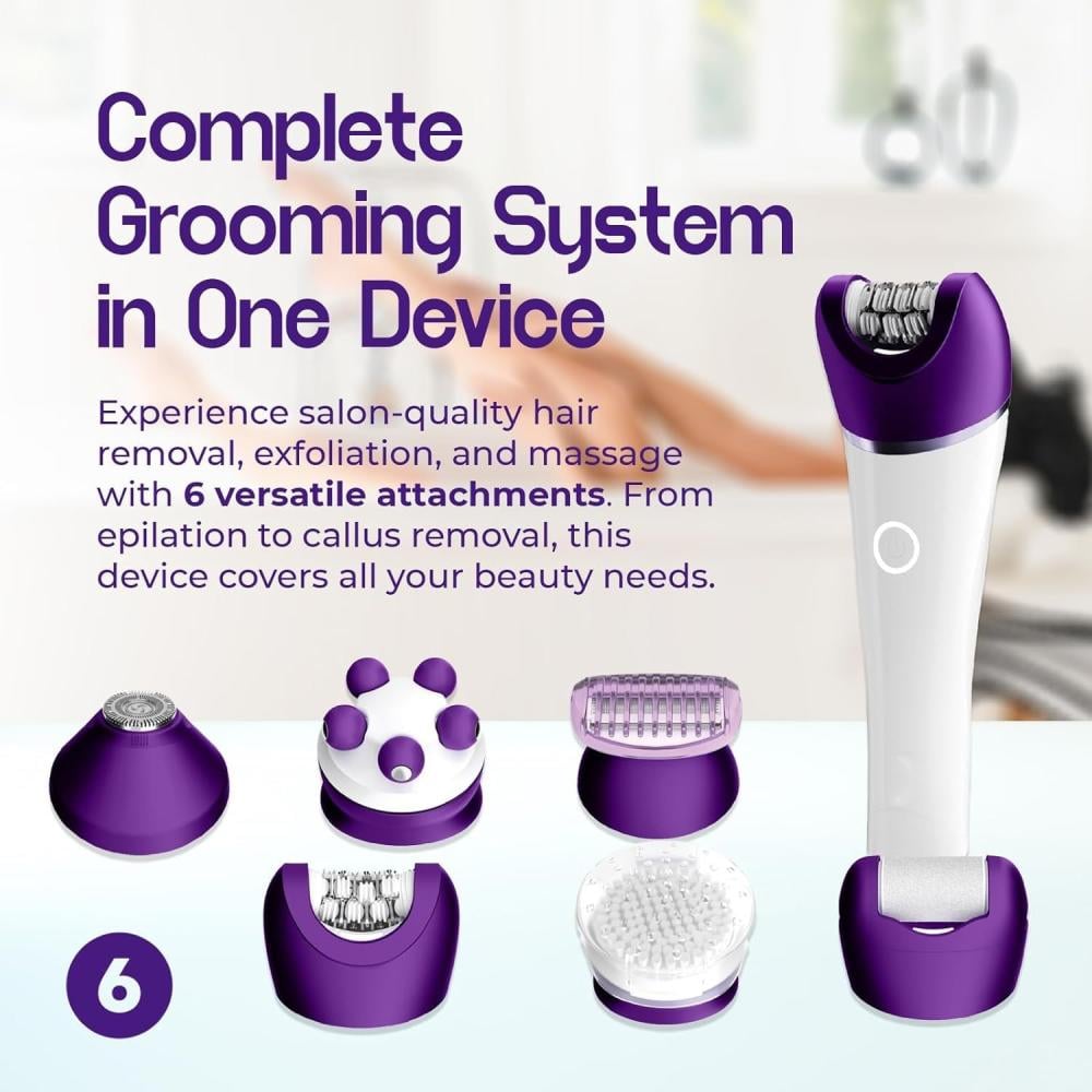 جهاز إزالة الشعر 6 في 1 هو الحل المتكامل للعناية بجسمك. يجمع بين إزالة الشعر، الحلاقة، التقشير، التدليك، والعناية بالقدمين، ليمنحك نعومة تدوم وراحة تشبه نتائج الصالونات وكل هذا من منزلك.