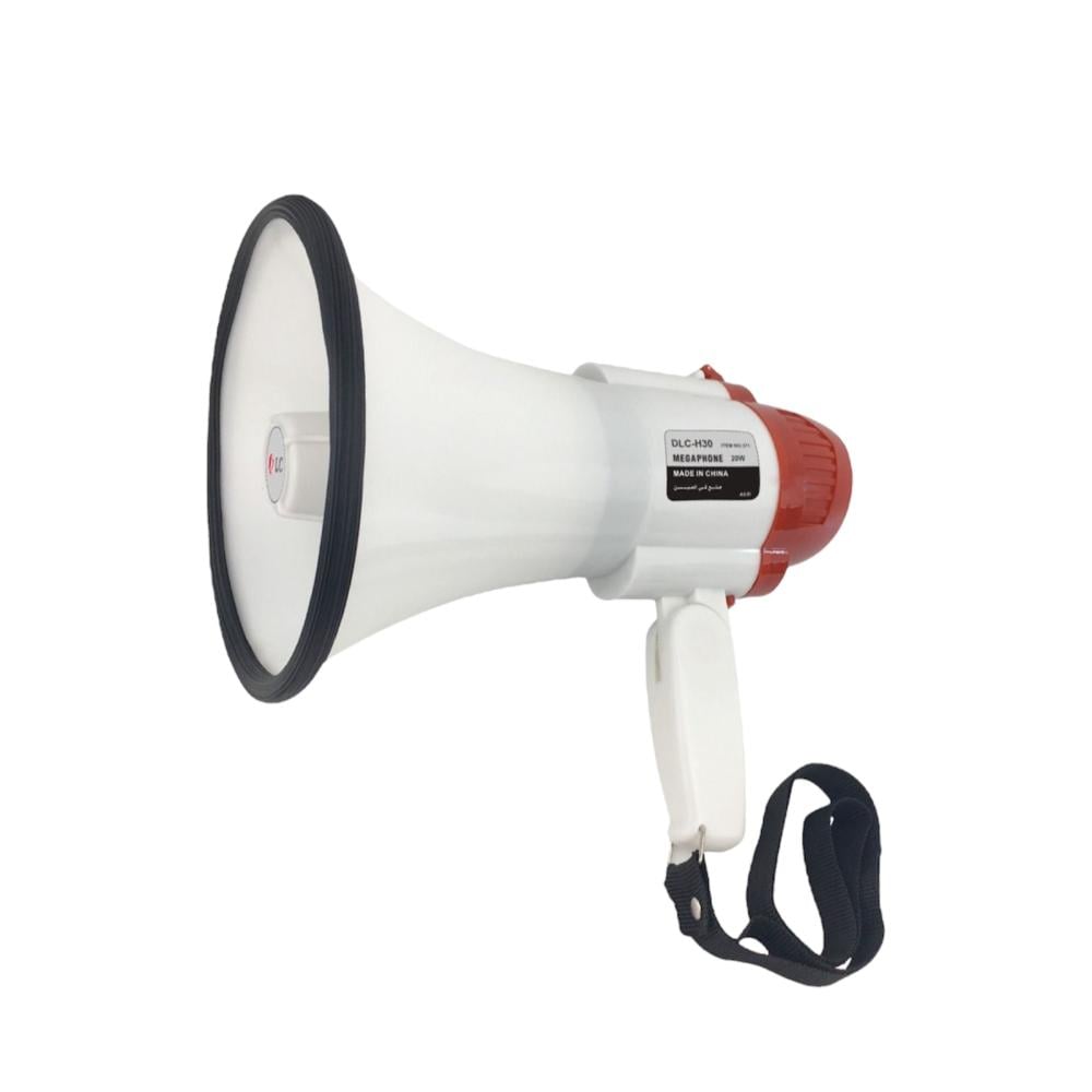 مكبر صوت محمول يدوي (بوق)، وهو من طراز "PORTABLE SPEAKER" من ماركة "DLC". يتميز بتصميم كلاسيكي باللونين الأبيض والأحمر، مع مقبض قابل للطي وحزام لسهولة الحمل والاستخدام. يحتوي على لوحة تحكم في الخلف مع أزرار للوظائف المختلفة، وميكروفون مدمج.