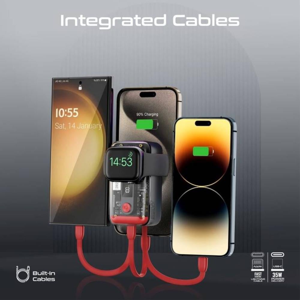 • كابل USB-C™ مدمج وكابلات Lightning: لا داعي للقلق الآن بشأن حمل كابلات شحن متعددة لهواتفك. مع Mavrix المتميز، استمتع بتجربة شحن سهلة مع كابلات الشحن المدمجة. تأتي البطارية مزودة بموصل Lightning Connector بقدرة 12 واط وكابلات توصيل طاقة USB-C™ بقدرة 35 واط لشحن أجهزة متعددة.
